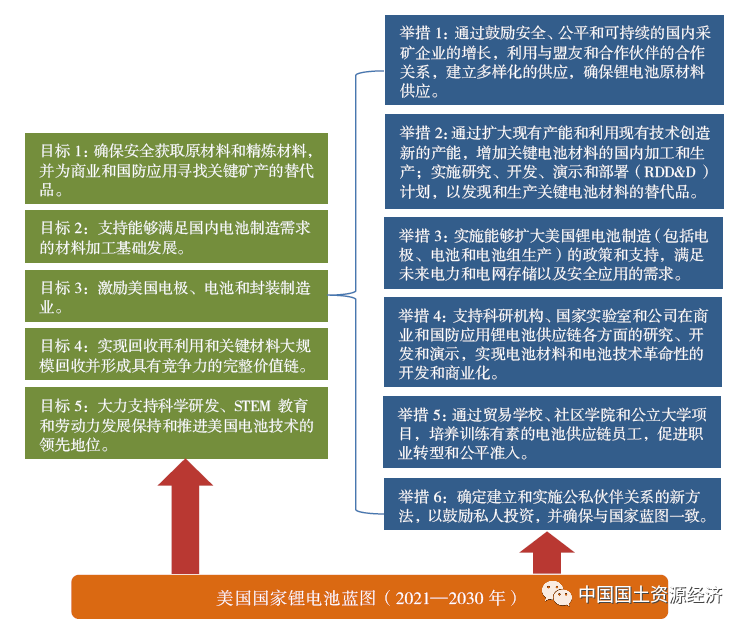 據(jù)基準(zhǔn)礦物情報2021年5月統(tǒng)計數(shù)據(jù),中國電池生產(chǎn)能力全球最高,達(dá)567吉瓦時,其次是美國59吉瓦時、歐洲52吉瓦時、韓國37吉瓦時和日本30吉瓦時;在電池陰極、陽極、電解質(zhì)溶液、分離器等制造占比中,中國最高。為減少美國對鈷、鋰、鎳等電池所需關(guān)鍵礦產(chǎn)的國外依賴,2021年6月,美國發(fā)布國家鋰電池藍(lán)圖(2021—2030年)。到2030年,美國及其合作伙伴將建立一個安全的電池材料和技術(shù)供應(yīng)鏈,支持美國長期的經(jīng)濟(jì)競爭力和公平的就業(yè)機(jī)會,實現(xiàn)脫碳,滿足國家安全需要。藍(lán)圖設(shè)定關(guān)鍵材料獲取、替代品研發(fā)、產(chǎn)業(yè)激勵、回收利用、人員培訓(xùn)等5項目標(biāo),制定鼓勵美國國內(nèi)礦業(yè)開發(fā)、加強(qiáng)合作、擴(kuò)大技術(shù)創(chuàng)造、加強(qiáng)人員培訓(xùn)等6項舉措(圖2)。