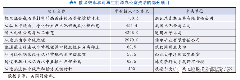 2021年,美國能源部成立礦產(chǎn)可持續(xù)發(fā)展司,旨在從上游、中游到下游促進(jìn)關(guān)鍵礦產(chǎn)形成環(huán)境、經(jīng)濟(jì)和地緣政治可持續(xù)供應(yīng)鏈,并投入大量資金支持相關(guān)技術(shù)的研發(fā)(表4)。同時,成立鋰電池回收研發(fā)中心、關(guān)鍵材料研究所等機(jī)構(gòu),促進(jìn)關(guān)鍵材料技術(shù)的創(chuàng)新。