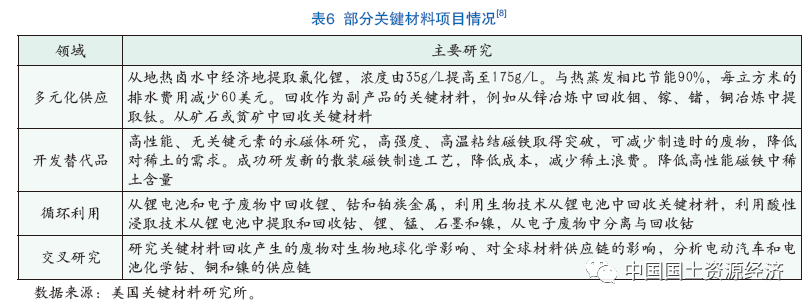關(guān)鍵材料研究所由艾姆斯國家實驗室主導(dǎo),由愛達(dá)荷州國家實驗室、勞倫斯利弗莫爾國家實驗室、橡樹嶺國家實驗室,以及13家美國公司和6所大學(xué)組成,致力于關(guān)鍵材料的多元化供應(yīng)、開發(fā)替代品、循環(huán)利用、交叉研究等,涵蓋從分離、加工到再利用和回收的供應(yīng)鏈研發(fā)(表6)。最初,關(guān)鍵材料研究所專注于鏑、鋱、銪、釹、釔、鋰、碲等,從2019年開始,專注于稀土材料、電池材料(鋰、鈷、錳、石墨)、鈦和氦。關(guān)鍵材料研究所自2013年成立以來,已披露150項發(fā)明,提交56項專利申請,獲得26項專利,并向美國公司授權(quán)10項技術(shù),包括用于3D打印稀土磁體以減少廢物技術(shù)、用于輕型汽車和飛機(jī)的鈰鋁合金技術(shù),以及用于稀土分離的膜溶劑萃取技術(shù)等。