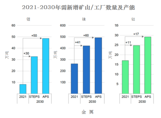 “例如,在APS情境下預(yù)測(cè)2030年供需缺口最大的鋰的需求將增長(zhǎng)5倍至500萬(wàn)噸,相當(dāng)于需要新建50座新的礦山”,報(bào)告稱。