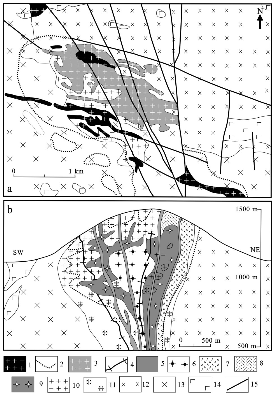 在火山侵入雜巖體中賦存有四個(gè)獨(dú)立的網(wǎng)脈狀礦帶。主礦帶位于巖體西側(cè),即Erdenet礦床,是一條由2~5mm的細(xì)脈組成的近垂直的網(wǎng)狀脈帶。長(zhǎng)約2400m,寬300~1300m,中心部位垂向延深達(dá)1000m,而靠近斑巖邊部延深約600~700m。