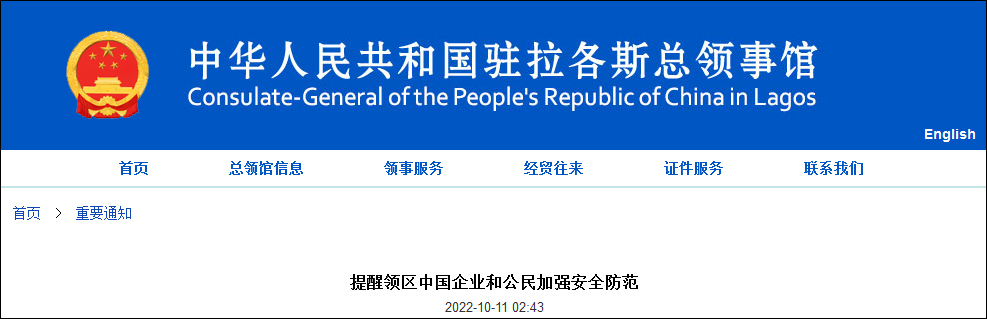 今年外交部和中國駐尼日利亞使領(lǐng)館已發(fā)出通知,提醒中國公民近期暫勿前往尼博爾諾、約貝、阿達瑪瓦、奧貢、奧遜、卡杜納、贊法拉和尼日爾共8州,已在當?shù)刂袊窈蜋C構(gòu)請盡快撤離或轉(zhuǎn)移至相對安全區(qū)域。謹慎前往科吉、拉各斯、高原、;佟⒛喜祭、埃努古、納薩拉瓦、貝努埃、埃邦伊、塔拉巴、卡諾、包奇、河流、克羅斯河、埃多、翁多、阿比亞、阿夸伊博姆、巴耶爾薩、三角洲和伊莫共21州,已在當?shù)厝藛T和機構(gòu)密切關(guān)注安全形勢,保持高度謹慎,加強安全防范和應急準備。在其他地區(qū)人員加強防范,注意安全。如遇緊急情況,請及時報警并與駐尼日利亞使領(lǐng)館聯(lián)系。