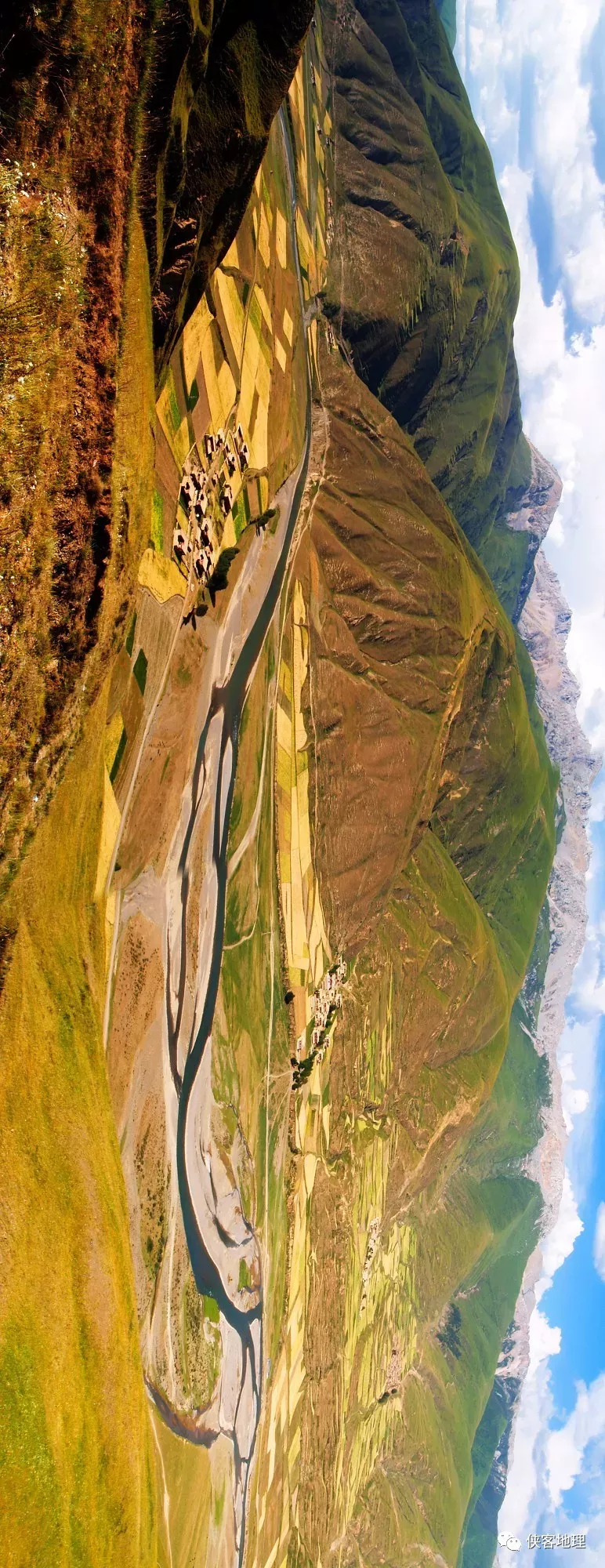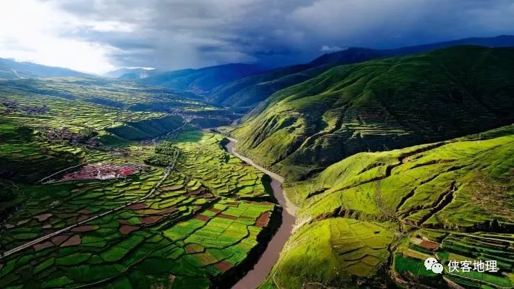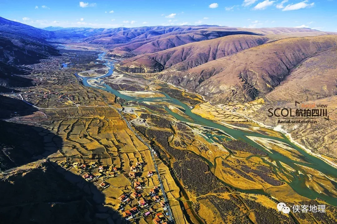 鮮水河的谷地,卻水草豐美、阡陌縱橫、村舍儼然(攝影/康巴阿哥,源于航拍四川)