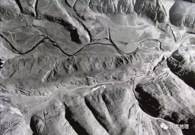 長圖預警:蝦拉沱盆地內“肘狀”水系,后部山體上的地裂縫清晰可見(李忠東攝于2006)