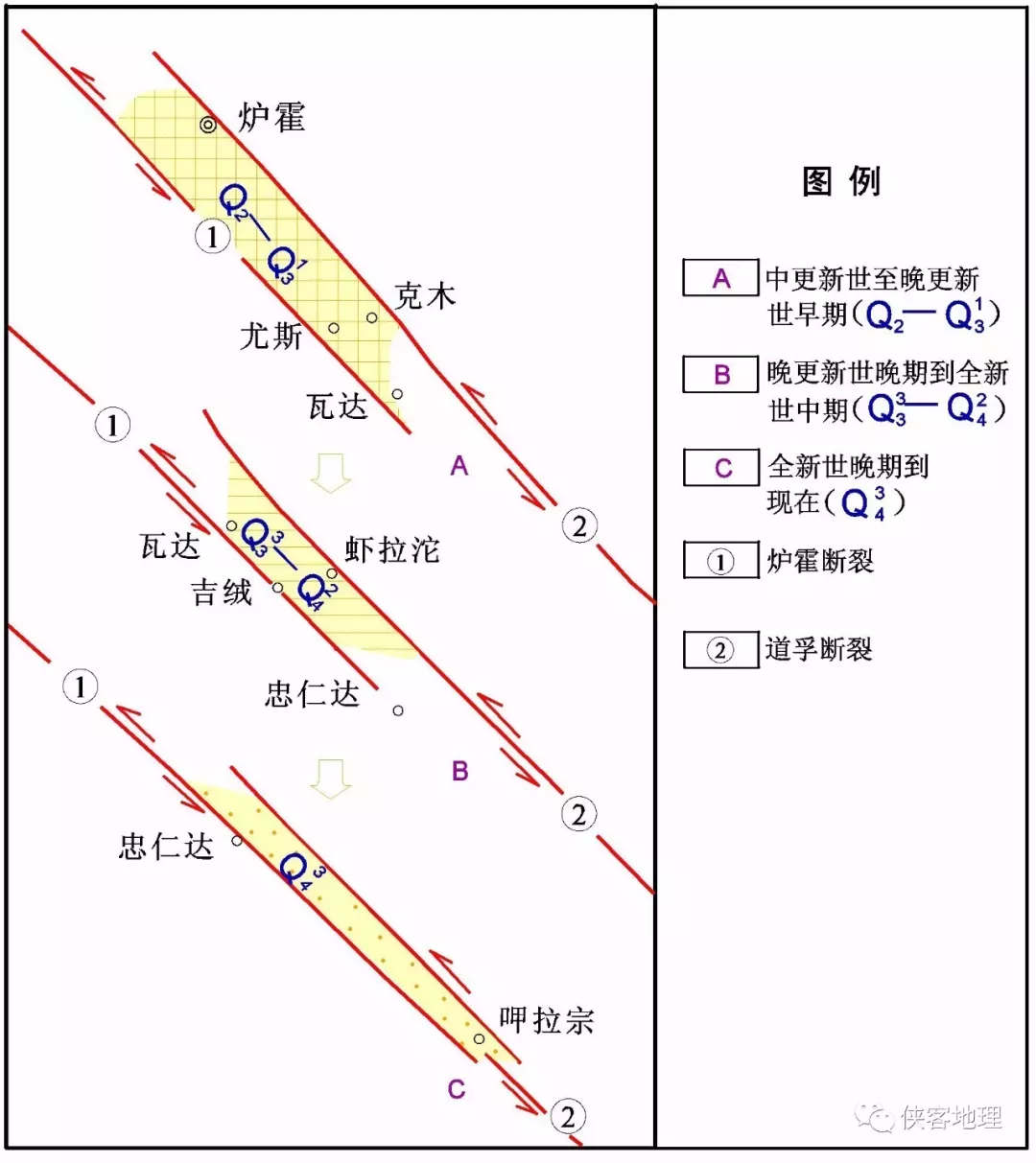 1930年,美國地質學家阿若德·赫姆(Amort· Heim)與Edgar牧師再次進入鮮水河地震帶開展調查,在其《道孚地震區(qū)》一文中他寫道:“該地裂縫帶長約85公里,仍然沿爐霍斷裂展布。按時代先后,地震地裂縫帶可分為:近代的――包括過去40-50年來所產(chǎn)生的破裂;次近代的――包括后期侵蝕下明顯加寬的地裂縫,時代可能始于晚第四紀;古代的――包括那些完全是侵蝕成因的表面效應,地震成因是由其他證據(jù)推斷的地裂縫”。