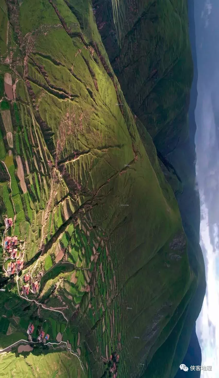 圖中右側山體明顯受斷層線控制,山體表面那些如蚯蚓狀的溝,就是地震形成的地裂縫,它們就象一道道傷疤,與左側的田園牧歌形成極大反差(攝影/劉乾坤)