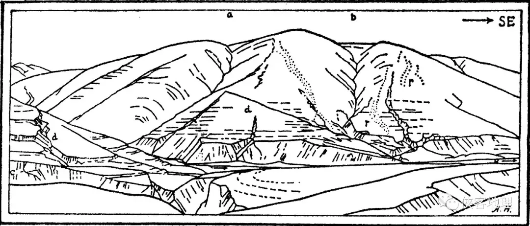 阿諾德·赫姆所繪的爐霍恰叫地裂縫素描圖(c由次近代裂縫發(fā)展而來的縱向峽谷;d由次近代裂縫生成的橫向峽谷;r河流從遠處左側流過。水平線表示人造平臺地)