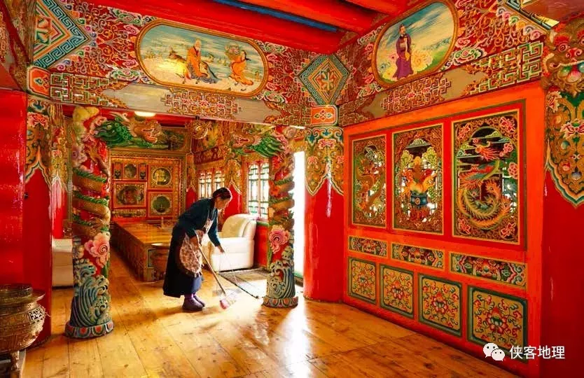 也許正是因為家園來之不易,居住在鮮水河斷裂帶的人們似乎更加珍惜生命,熱愛生活。這些看起來好像專門為防震而設計的建筑,其外部和內部的裝飾都非常精美,甚至稱得上豪華,成為康巴藏區(qū)民居的奇葩。尤其是在內部裝飾上,他們利于木材便于著色和雕刻的特點,將家居建造成為雕、塑、繪的民間藝術殿堂,再加上地上色彩鮮艷的地毯,墻上圖案精美的掛毯等,營造出華麗、典雅、富麗堂皇的效果,被人戲稱為“散落人間的仙境皇宮”。
