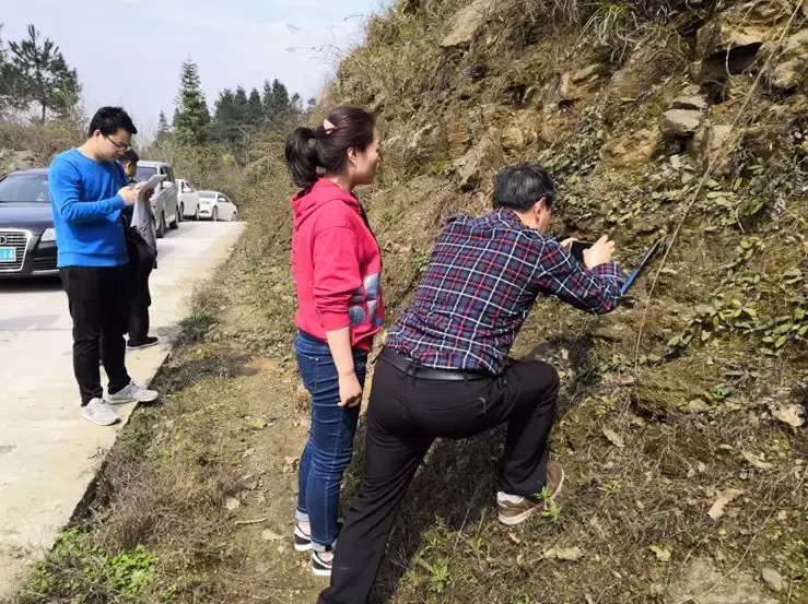 旅游地學(xué)工作者在勘查腕足類古生物化石