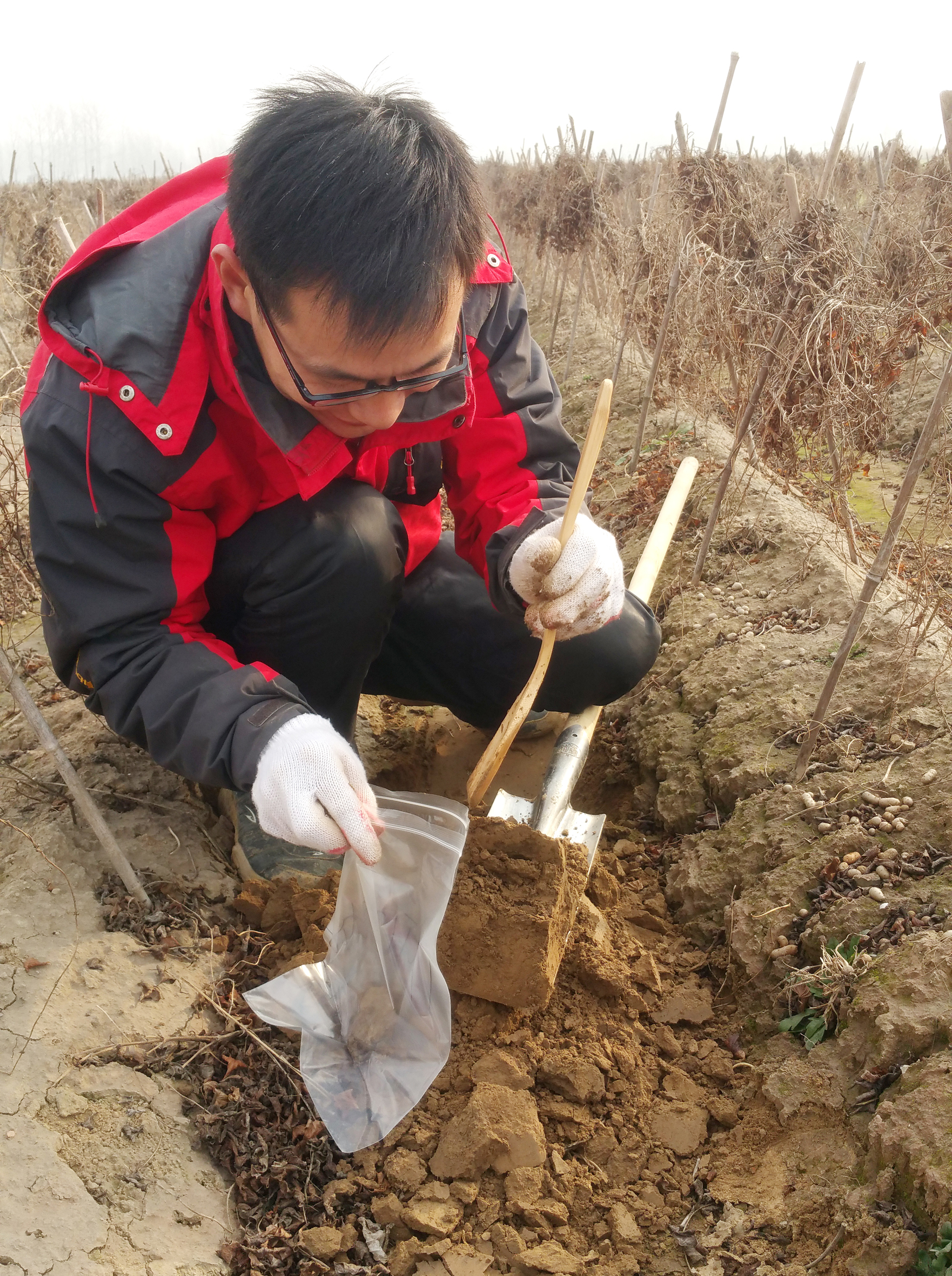 ▲地質(zhì)人員在山藥田取樣土品。(宋亮攝)