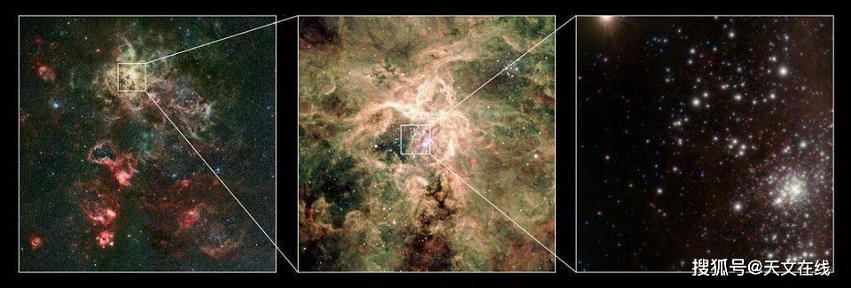 馬賽克中有蜘蛛星云:整個局部星系群中最大的恒星形成區(qū)域。
