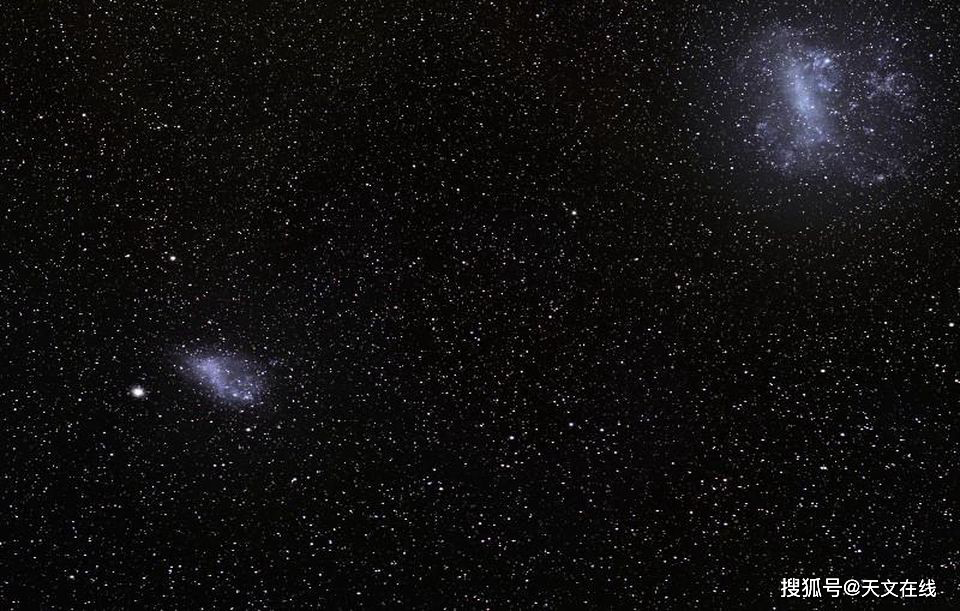 圖解 :南部天空中可觀測到大麥哲倫星云(右上方)和小麥哲倫星云(左下角)。五百年前他們曾幫助麥哲倫完成了那次舉世聞名的航行。事實上,大麥哲倫星云大概在160-165000光年之外,而小的則更遠一些,在198000光年之外。圖源:ESO/S. BRUNIER