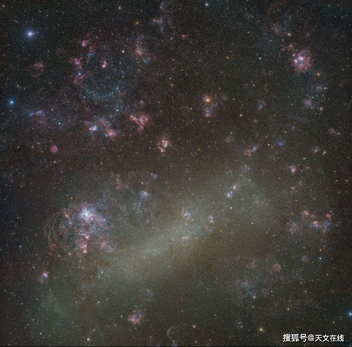 圖解:大麥哲倫星云是上世紀最近超新星的所在地。這塊粉色區(qū)域不是人造的,它很可能是由重力相互作用和潮汐力引發(fā)的,是電離氫和活躍恒星形成的標志。值得注意的是,把這張傳統(tǒng)的業(yè)余長曝光圖片與西爾·奧斯特拉爾團隊拍攝的照片相比,它缺少了太多細節(jié)。圖源:JESÚS PELÁEZ AGUADO