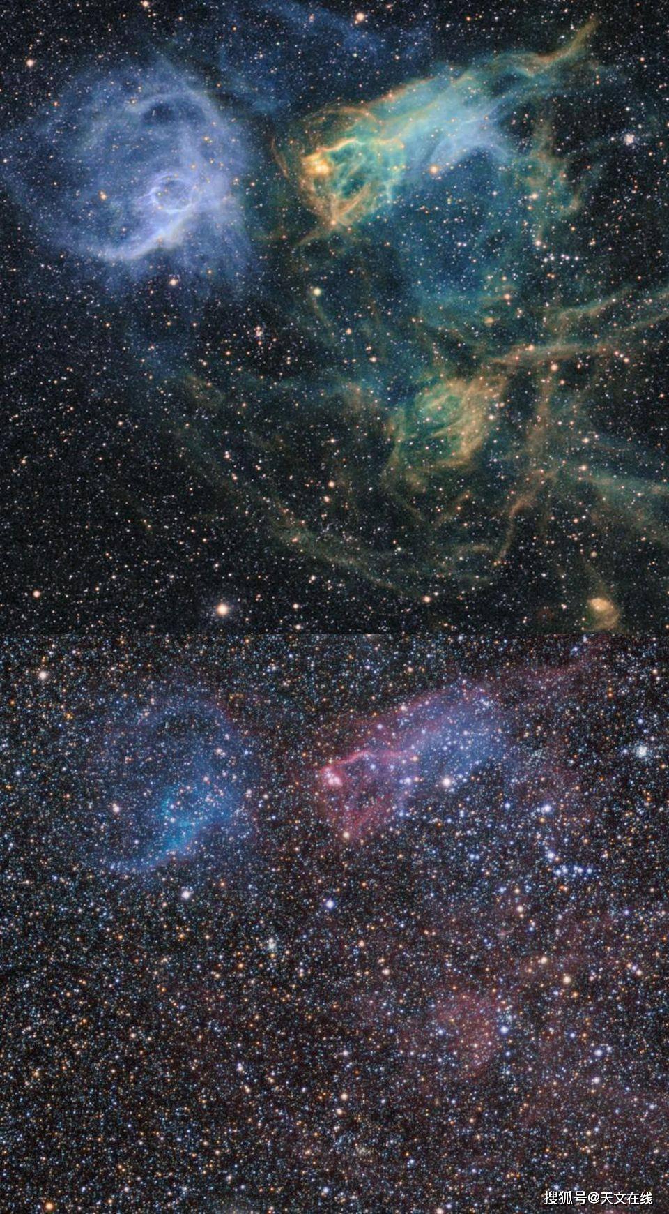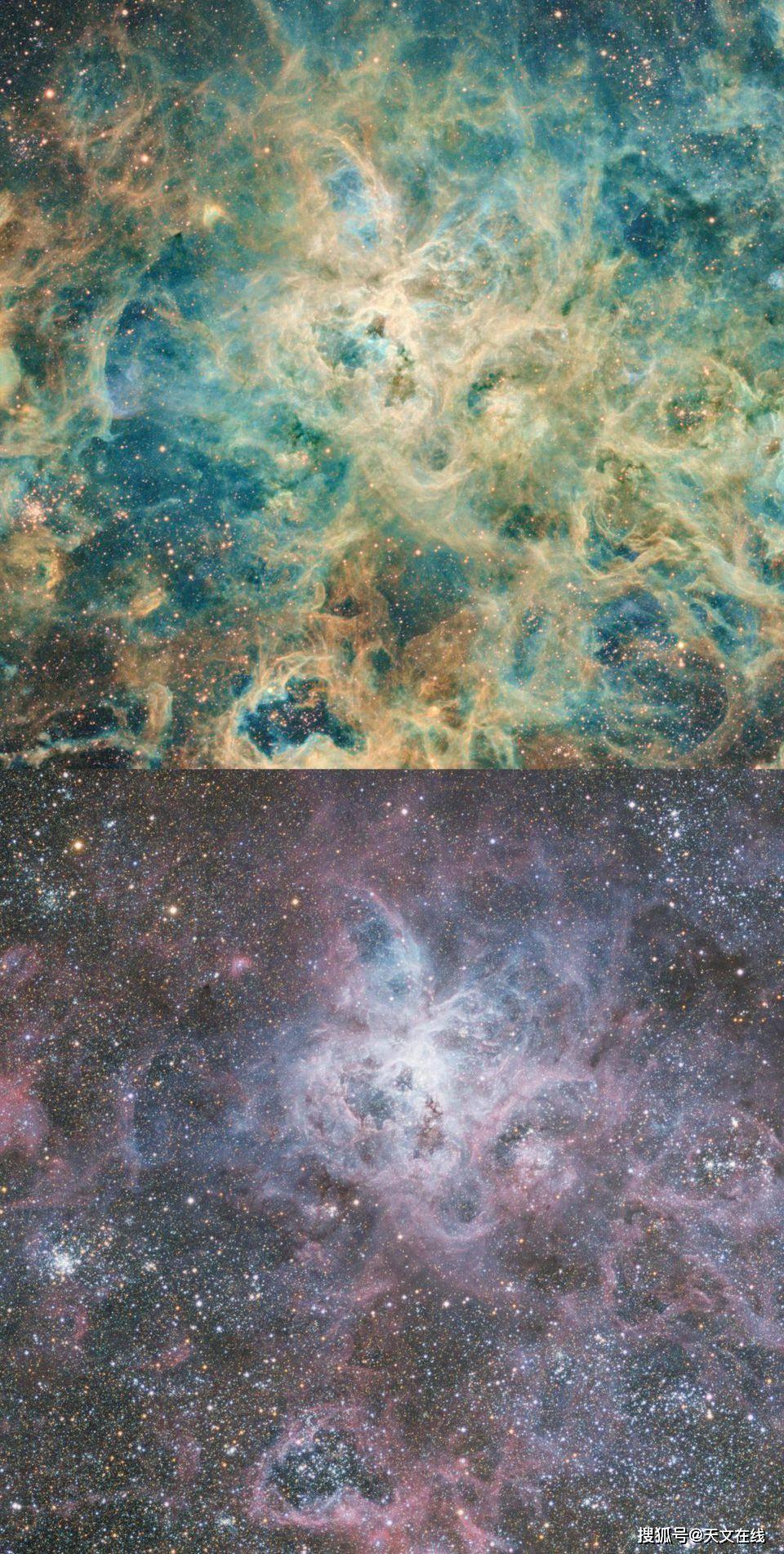 圖解:西爾·奧斯特拉爾團隊作品:蜘蛛星云的大部分區(qū)域,局部星系群的最大恒星形成區(qū)。在上面那張圖里,你可以看到氫氣,硫磺和氧氣存在的痕跡,它們展現(xiàn)了大麥哲倫星云豐富的氣體和等離子體結構。在下面那張圖里,你可以看到RGB色彩合成,這代表了在新形成的年輕恒星中的反射和星云發(fā)散。 圖源:CIEL AUSTRAL
