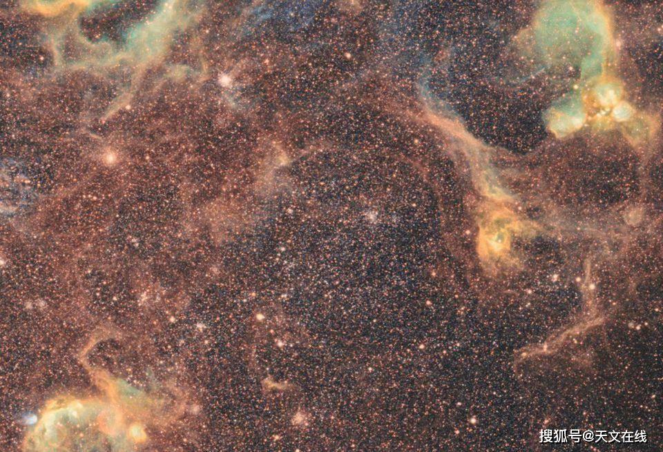 圖解:西爾·奧斯特拉爾團隊制作的大馬賽克中的小區(qū)域位于大麥哲倫星云的中央,但它僅占整個馬賽克的0.5%。請注意,在這個紅、綠、藍組成的彩色空間里,還有很多清晰可見的細節(jié)。圖源:CIEL AUSTRAL