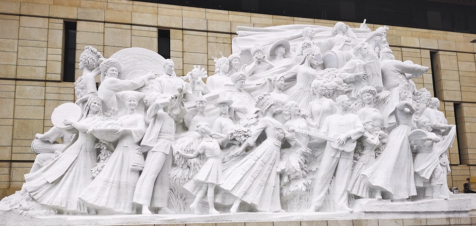 記者跟隨隊(duì)伍進(jìn)入館區(qū),首先映入眼簾的是展覽館廣場上矗立的五大主題雕塑,分別為《旗幟》《信仰》《偉業(yè)》《攻堅(jiān)》《追夢》,76個(gè)人物與583塊漢白玉融為一體,靜靜地講述著中國共產(chǎn)黨一百年來為人民謀幸福、為民族謀復(fù)興的偉大歷程。記者在采訪中了解到,為了尋找合適的漢白玉石材,相關(guān)團(tuán)隊(duì)奔赴全國各地的礦坑實(shí)地查看石材質(zhì)量,最終選定四川雅安夾金山腳下的漢白玉。一塊塊精選的漢白玉也在默默地訴說著中國礦業(yè)與中國共產(chǎn)黨命運(yùn)與共的深厚情緣。