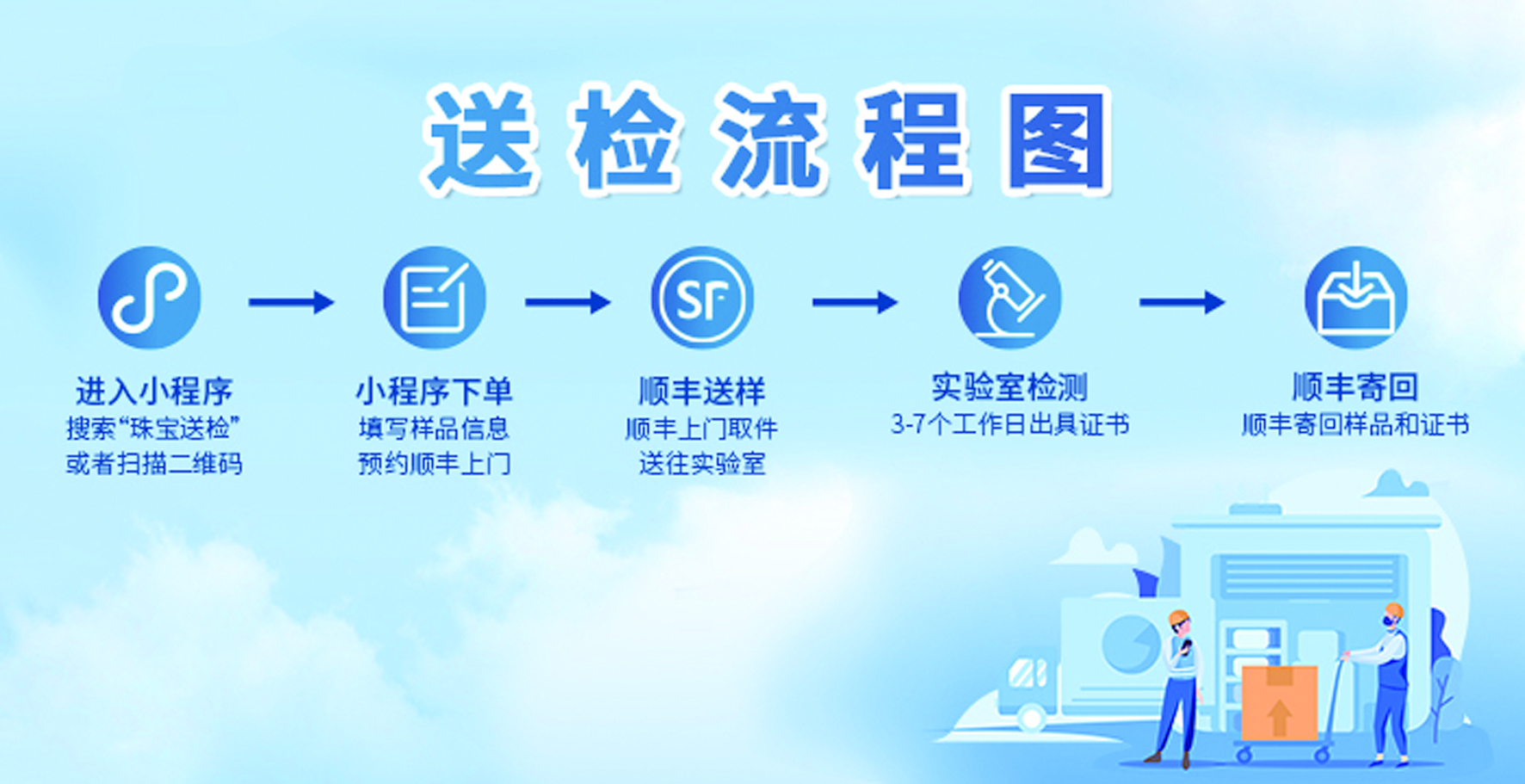 證芯科技聯(lián)合珠寶國檢推出“珠寶送檢”小程序,恪守高標準、嚴要求、保質守時的原則,為消費者提供無接觸式的專業(yè)珠寶檢測服務。消費者在“珠寶送檢”小程序上傳送檢樣品信息,選擇相應的珠寶國檢實驗室,預約順豐快遞上門取件,即可享受安全送檢物流服務。順豐物流系統(tǒng)將為訂單匹配唯一訂單號,訂單號與珠寶國檢實驗室檢測系統(tǒng)連接,消費者可在訂單列表中實時查看送檢進度。
