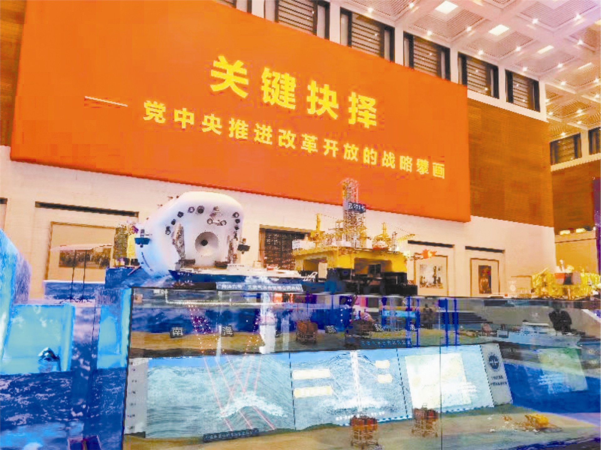 “偉大的變革——慶祝改革開放40周年大型展覽”目前正在國家博物館隆重展出。從西大門進場,自然資源部中國地質調查局廣州海洋地質調查局在這里設立的展臺——以我國海域天然氣水合物試采平臺“藍鯨一號”和天然氣水合物綜合調查船“海洋六號”模型為主體內容的天然氣水合物試采成果展臺在一幅巨大的海洋圖片背景下顯得尤為突出醒目,也吸引了大批參觀者駐足。