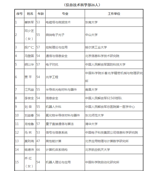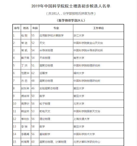 公告稱,2019年中國科學院院士增選通信評審工作已經結束。根據(jù)《中國科學院院士章程》和《中國科學院院士增選工作實施細則》的規(guī)定,將初步候選人名單予以公布。2019年中國科學院院士增選初步候選人共181人,其中數(shù)學物理學部29人,化學部28人,生命科學和醫(yī)學學部32人,地學部27人,信息技術科學部26人,技術科學部39人。