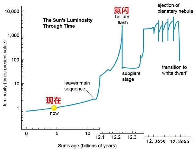 太陽的光度變化曲線,尖峰就是氦閃時代,第一次氦閃會在太陽脫離主序星12億年后發(fā)生,以后會越來越頻繁,一直到太陽的白矮星時代才會結束。