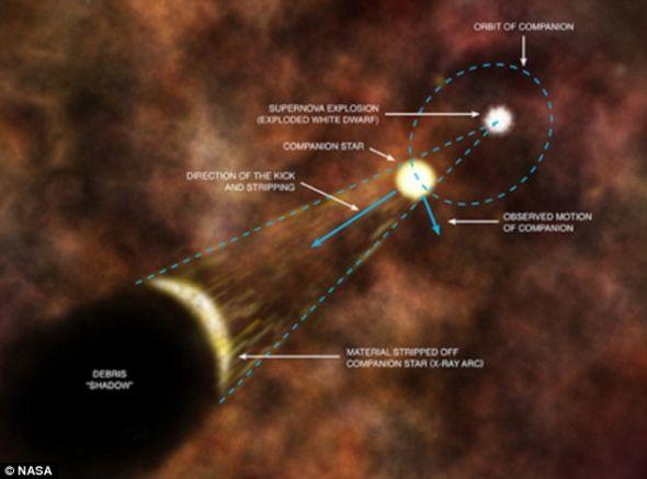 甚至超新星爆發(fā)都可能摧毀它的伴星,上圖是第谷Ia型超新星爆發(fā)時伴星得以幸存的示意圖,這算是一個比較不錯的結果!超新星爆發(fā)都可能摧毀恒星,它星系內(nèi)的行星就更不在話下了!