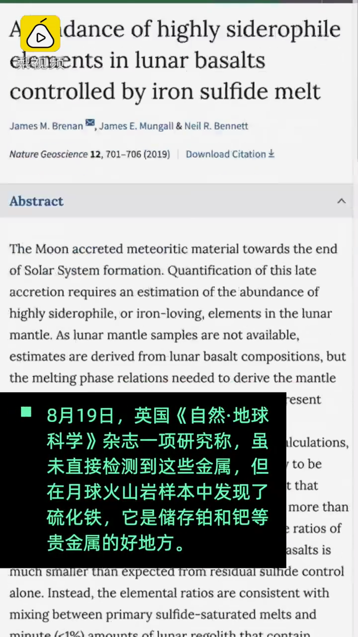 英國《自然·地球科學(xué)》雜志一項(xiàng)研究稱,雖未直接檢測到貴重金屬,但在月球火山巖樣本中檢測到的硫與其內(nèi)部存在的硫化鐵相關(guān),而硫化鐵正是儲存鉑和鈀等貴金屬的好地方。迄今為止,科學(xué)家一直未能從月球內(nèi)部深處采集到巖石樣本,因此無法驗(yàn)證此次實(shí)驗(yàn)的發(fā)現(xiàn)和推測。