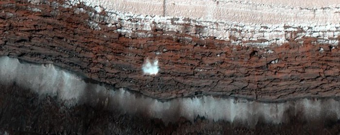 根據(jù)美國國家航空航天局(NASA)的圖像數(shù)據(jù),上圖所示的塵埃“爆炸”是由于冰和巖石在1600多英尺高的懸崖上翻滾而造成的。航天局解釋說,在火星這一部分的每個(gè)春季,一堆巖石沐浴在陽光下,會使其中的冰變暖到足以使其不穩(wěn)定,導(dǎo)致雪崩。大塊的冰和巖石混合物崩塌會掀起灰塵,產(chǎn)生圖像所顯示的“爆炸”。