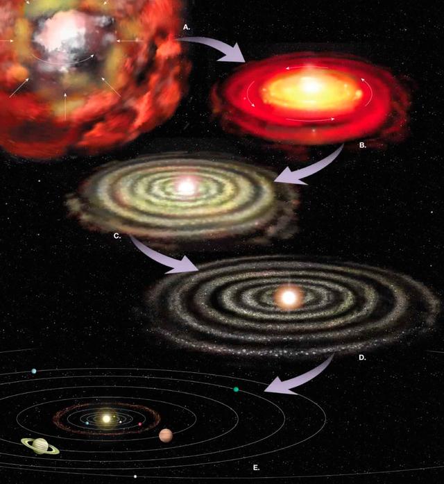 早在1796年,拉普拉斯就在他的《宇宙體系論》中,獨(dú)立提出了關(guān)于太陽(yáng)系起源的星云加說(shuō)?梢院(jiǎn)單的概括為:太陽(yáng)在一團(tuán)收縮的氣體云中形成,而行星則誕生于形成太陽(yáng)后在黃道面上的邊角料,當(dāng)然原文并沒(méi)有那么簡(jiǎn)單,下文我們也將簡(jiǎn)單介紹下現(xiàn)代恒星形成的過(guò)程。