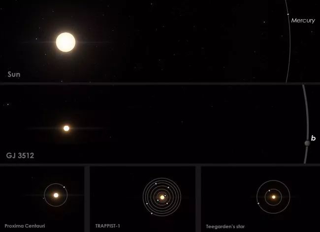 GJ 3512紅矮星系統(tǒng)(中)和太陽系(上)及其他部分紅矮星系統(tǒng)(下)的1:1對比圖。
