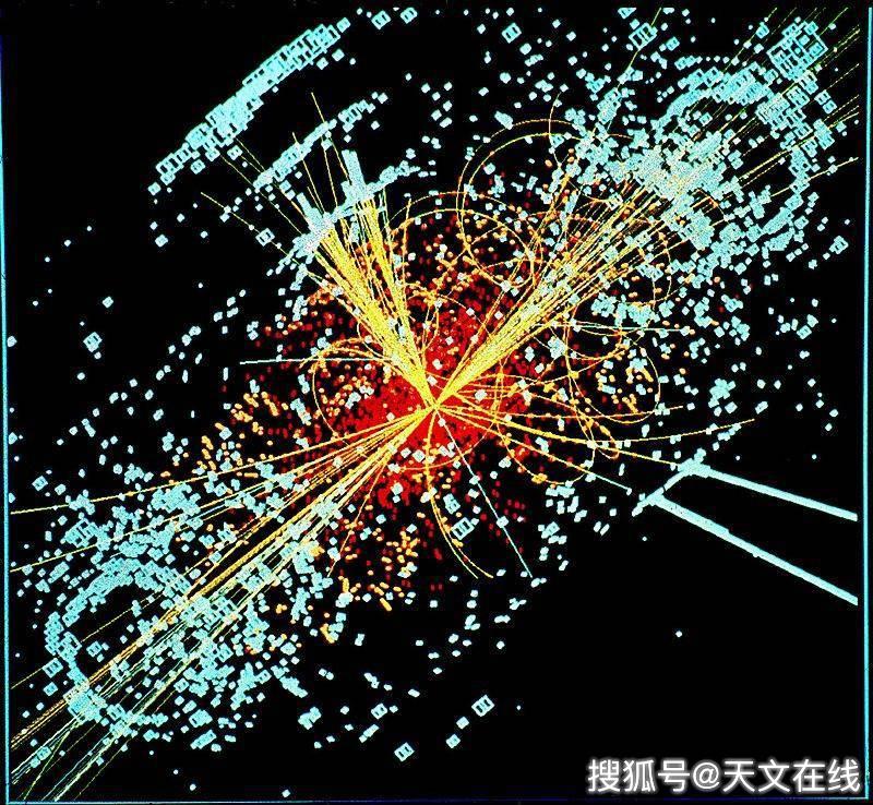 圖解:由大型強(qiáng)子對(duì)撞機(jī)中的緊湊μ子線圈得到的希格斯玻色子產(chǎn)生時(shí)的景象。它是通過衰變?yōu)閺?qiáng)子噴流的質(zhì)子與電子的碰撞形成的。