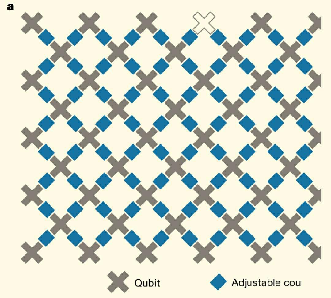 通俗的講就是量子計(jì)算機(jī)碾壓傳統(tǒng)超算的算力。量子計(jì)算的速度之源其實(shí)是量子比特,以谷歌本次所講的量子芯片為例,其內(nèi)部構(gòu)造如下: