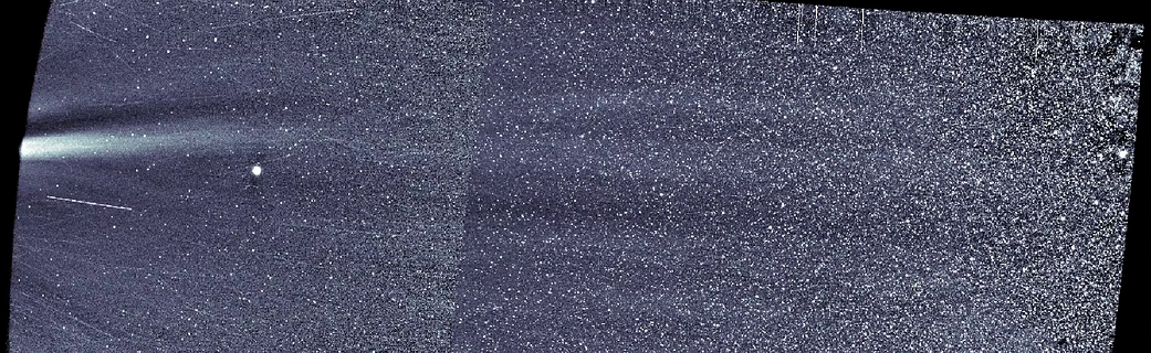 在視頻的右側(cè)可以看到銀河系的銀河中心。左邊可見(jiàn)的行星是水星。圖像中的白色細(xì)條是經(jīng)過(guò)WISPR相機(jī)前的灰塵顆粒。
