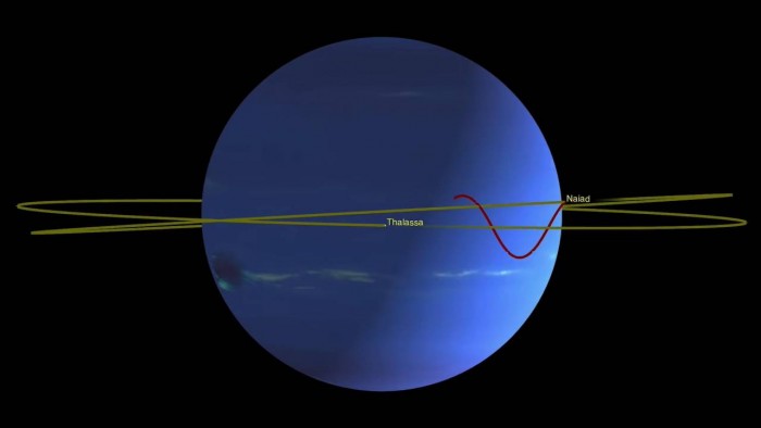 雖然兩顆衛(wèi)星的軌道相對較近,但它們的不同軌道使彼此相距超過約2200英里。那是因?yàn)橐愿斓乃俣冗\(yùn)行的Naiad被鎖定為一種波動(dòng)的運(yùn)動(dòng),以確保兩顆衛(wèi)星永遠(yuǎn)不會“偶遇”。無論兩顆衛(wèi)星完成其宿主行星軌道的次數(shù)多少,其模式都保持不變,Thalassa在其軌道上平穩(wěn)運(yùn)行,隨著Naiad的軌道呈鋸齒形,在其在姊妹衛(wèi)星的軌道上方或下方運(yùn)行。