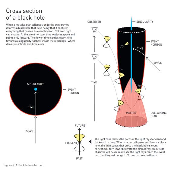 黑洞的形成 (左上) 黑洞橫截面 當(dāng)一顆巨大的恒星在自身引力作用下塌縮時(shí),它會形成一個質(zhì)量很大的黑洞,捕獲穿越其事件視界的一切東西。哪怕是光都無法逃離黑洞。在事件視界中,時(shí)間取代空間,所有路徑向內(nèi)指。時(shí)間流將一切帶向黑洞最深處的奇點(diǎn)——在這里,密度是無限的,時(shí)間也止于此。 (右下) 光錐表示光線在時(shí)間上向前和向后的路徑。當(dāng)物質(zhì)塌縮并形成黑洞時(shí),穿過黑洞事件視界的光錐將向內(nèi)朝奇點(diǎn)運(yùn)動。外部的觀察者永遠(yuǎn)不會真正看到光線到達(dá)事件視界。他們看到的,只是光線接近事件視界。之后的就沒有人能看到。