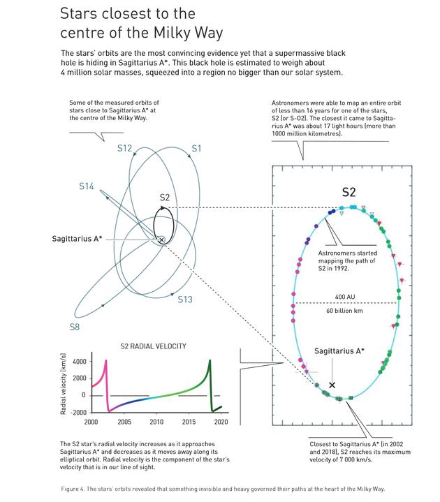 這兩顆恒星的軌道是迄今為止最令人信服的證據(jù),證明在人馬座A*中隱藏著一個超大質(zhì)量黑洞。據(jù)估計(jì),這個黑洞的質(zhì)量約為太陽質(zhì)量的400萬倍,而所有這些質(zhì)量都擠壓在一個不比太陽系大多少的區(qū)域內(nèi)。