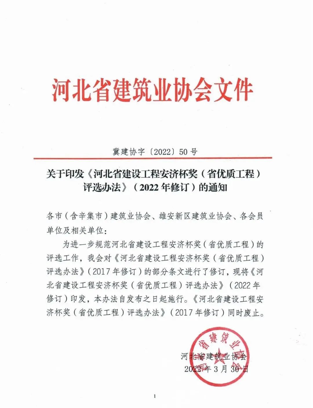 關(guān)于印發(fā)《河北省建設(shè)工程安濟(jì)杯獎(省優(yōu)質(zhì)工程)評選辦法》(2022年修訂)的通知