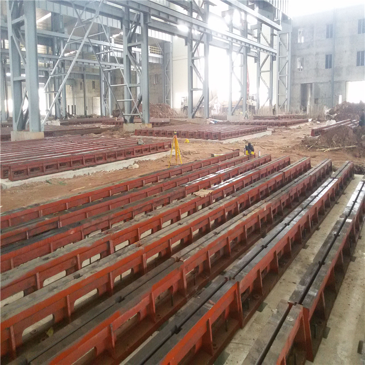 二.鑄鐵地梁安裝后,要任意1m長度內(nèi),水平偏差度不大于1mm,全長不大于2mm,軌道這間對應(yīng)點的水平偏差不大于1mm,每兩條軌道之間的平行度偏差小于2mm。