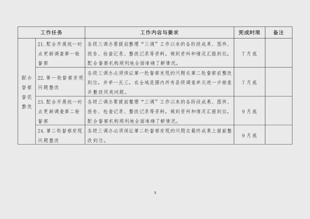 各級(jí)三調(diào)辦要對(duì)照《全國(guó)“三調(diào)”統(tǒng)一時(shí)點(diǎn)更新調(diào)查階段工作任務(wù)分解表》(見(jiàn)附件),逐縣逐項(xiàng)明確工作內(nèi)容、目標(biāo)要求和完成時(shí)限,建立清單、任務(wù)到人,對(duì)賬銷號(hào)、責(zé)任到人。各省級(jí)三調(diào)辦要根據(jù)各縣級(jí)調(diào)查單元工作的實(shí)際進(jìn)度,壓茬推進(jìn)初始調(diào)查收尾與統(tǒng)一時(shí)點(diǎn)更新調(diào)查,統(tǒng)一時(shí)點(diǎn)更新調(diào)查與其前后兩輪督察、督察整改到位與全省舉一反三整改到位的工作要有機(jī)配合與無(wú)縫銜接。