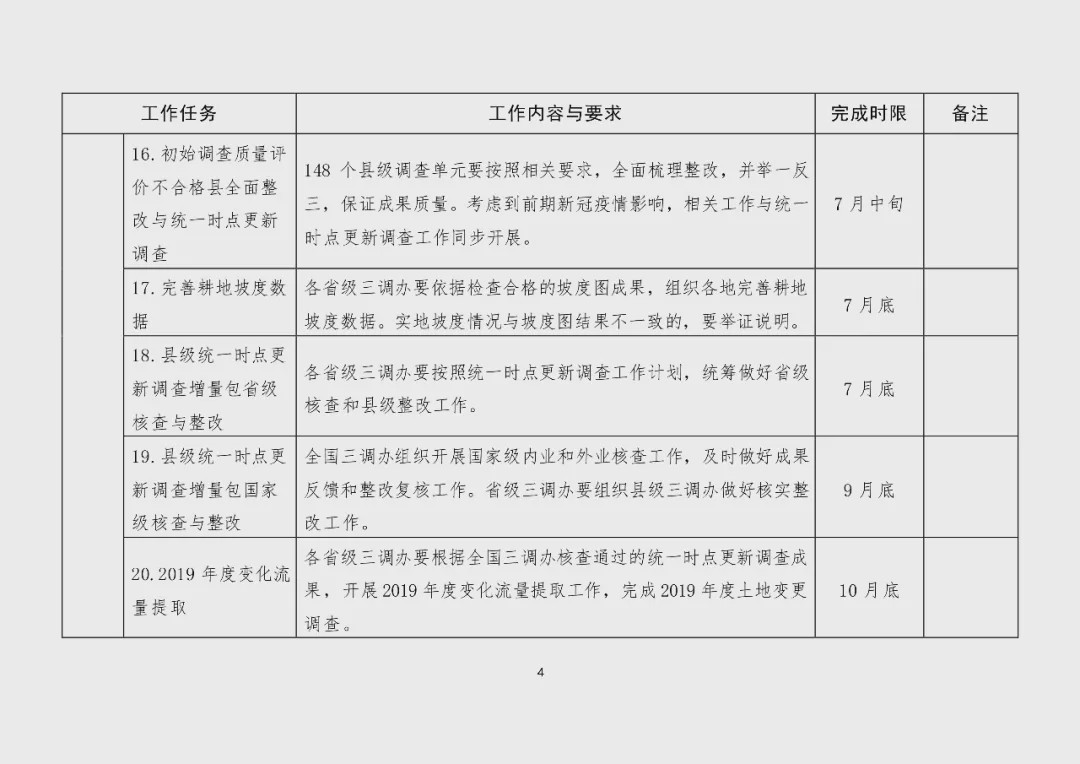 各級(jí)三調(diào)辦要按照《國(guó)務(wù)院第三次全國(guó)國(guó)土調(diào)查領(lǐng)導(dǎo)小組辦公室關(guān)于開(kāi)展第三次全國(guó)國(guó)土調(diào)查統(tǒng)一時(shí)點(diǎn)更新調(diào)查的通知》(國(guó)土調(diào)查辦發(fā)〔2019〕24號(hào))明確的任務(wù)、流程和要求,扎實(shí)做好統(tǒng)一時(shí)點(diǎn)更新調(diào)查各項(xiàng)工作?紤]到前段時(shí)期新冠肺炎疫情的影響,“三調(diào)”統(tǒng)一時(shí)點(diǎn)更新調(diào)查各項(xiàng)任務(wù)既定進(jìn)度向后順延3個(gè)半月。