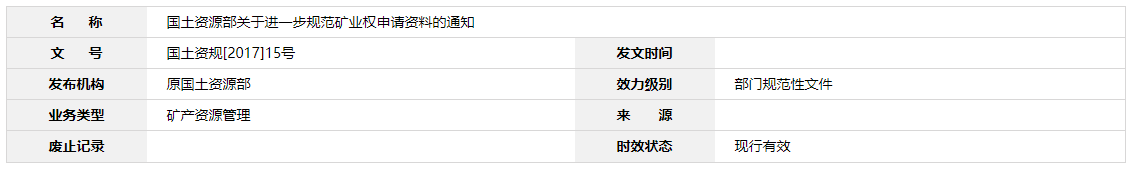 。ㄊ模┍就ㄖ2018年3月18日起施行,有效期5年!蛾P于采礦權申請登記書式樣的通知》(國土資發(fā)〔1998〕14號)、《國土資源部關于印發(fā)探礦權、采礦權轉讓申請書、審批表及審批通知書格式的通知》(國土資發(fā)〔1998〕20號)、《國土資源部關于探礦權、采礦權申請資料實行電子文檔申報的公告》(國土資源部公告2007年第12號)、《國土資源部辦公廳關于做好探礦權采礦權登記與礦業(yè)權實地核查工作銜接有關問題的通知》(國土資廳發(fā)〔2009〕54號)、《關于調整探礦權、采礦權申請資料有關問題的公告》(國土資源部公告2009年第17號)、《國土資源部關于規(guī)范新立和擴大勘查范圍探礦權申請資料的通知》(國土資發(fā)〔2009〕103號)、《國土資源部關于申請新立和擴大勘查范圍探礦權報件清單的公告》(國土資源部公告2009年第22號)、《國土資源部辦公廳關于印發(fā)〈礦業(yè)權登記數據更新與換證工作方案〉的通知》(國土資廳發(fā)〔2010〕2號)、《國土資源部關于調整探礦權申請資料有關問題的公告》(國土資源部公告2011年第25號)、《國土資源部辦公廳關于調整國土資源部礦業(yè)權(非油氣礦產)申請審批相關文件報送方式的函》(國土資廳函〔2014〕644號)同時廢止。