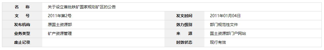 【礦產(chǎn)資源管理】關(guān)于設(shè)立首批鐵礦國家規(guī)劃礦區(qū)的公告