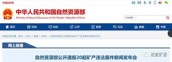 2022年3月17日,自然資源部在官網(wǎng)公開通報(bào)了20起礦產(chǎn)違法案件,并召開了新聞發(fā)布會(huì)。自然資源部通報(bào)的20起案件均涉及非法采礦罪。該新聞發(fā)布會(huì)信息鏈接地址為: