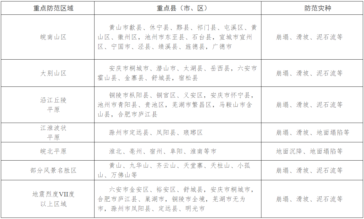 2.重點(diǎn)防范地段:在建地鐵輕軌沿線兩側(cè)1km范圍內(nèi);在建高速鐵路、高速公路和引江濟(jì)淮工程沿線兩側(cè)1km或第一斜坡帶范圍內(nèi);淮南煤礦區(qū)、淮北煤礦區(qū)、銅陵銅礦區(qū)、霍邱鐵礦區(qū)、廬江鐵(銅)礦區(qū)等5個(gè)礦山建設(shè)區(qū)域。