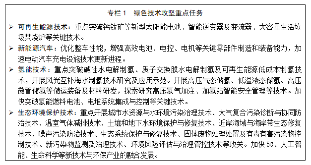 實(shí)施前沿和關(guān)鍵核心綠色技術(shù)攻堅(jiān)。鼓勵(lì)綠色技術(shù)創(chuàng)新載體加強(qiáng)超低能耗建筑、智能交通、智慧環(huán)境、碳捕集利用與封存等關(guān)鍵技術(shù)研究,重點(diǎn)突破動(dòng)力電池、氫能、儲(chǔ)能等新能源技術(shù)瓶頸。推動(dòng)研發(fā)一批具有自主知識(shí)產(chǎn)權(quán)、達(dá)到國(guó)際先進(jìn)水平的關(guān)鍵核心綠色技術(shù),瞄準(zhǔn)國(guó)際一流環(huán)境標(biāo)準(zhǔn),加快生態(tài)環(huán)境保護(hù)關(guān)鍵技術(shù)創(chuàng)新研發(fā)。