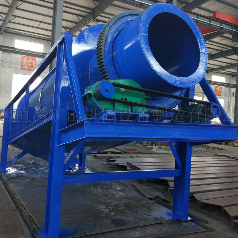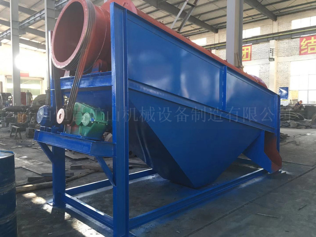 滾筒裝置傾斜安裝于機(jī)架上。電動(dòng)機(jī)(或柴油機(jī))經(jīng)減速機(jī)與滾筒裝置通過聯(lián)軸器連接在一起,驅(qū)動(dòng)滾筒裝置繞其軸線轉(zhuǎn)動(dòng)。當(dāng)物料進(jìn)入滾筒裝置后,由于滾筒裝置的傾斜與轉(zhuǎn)動(dòng),使篩面上的物料翻轉(zhuǎn)與滾動(dòng),使大塊物料(篩下產(chǎn)品)經(jīng)滾筒后端底部口排出,小塊物料(篩上產(chǎn)品)直接從篩體下部排出