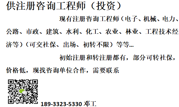 我司可提供注冊(cè)咨詢師,專業(yè)有:建筑、市政、公路、水利、農(nóng)業(yè)、工程技術(shù)經(jīng)濟(jì)、
