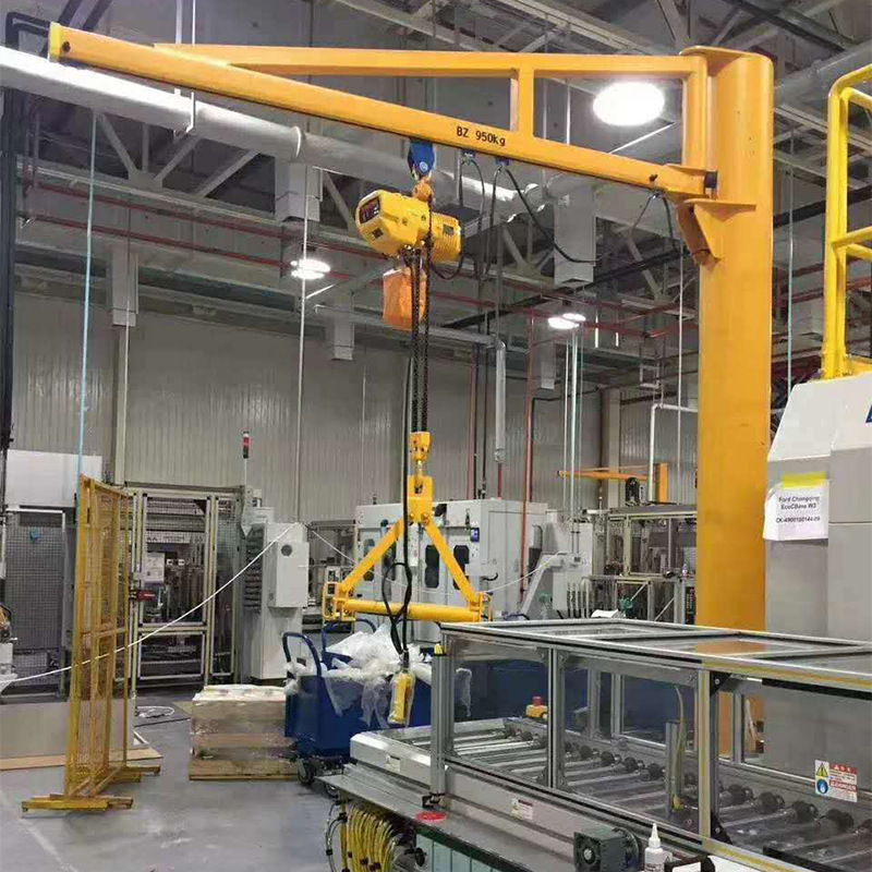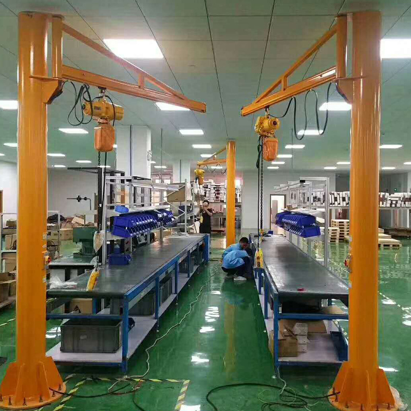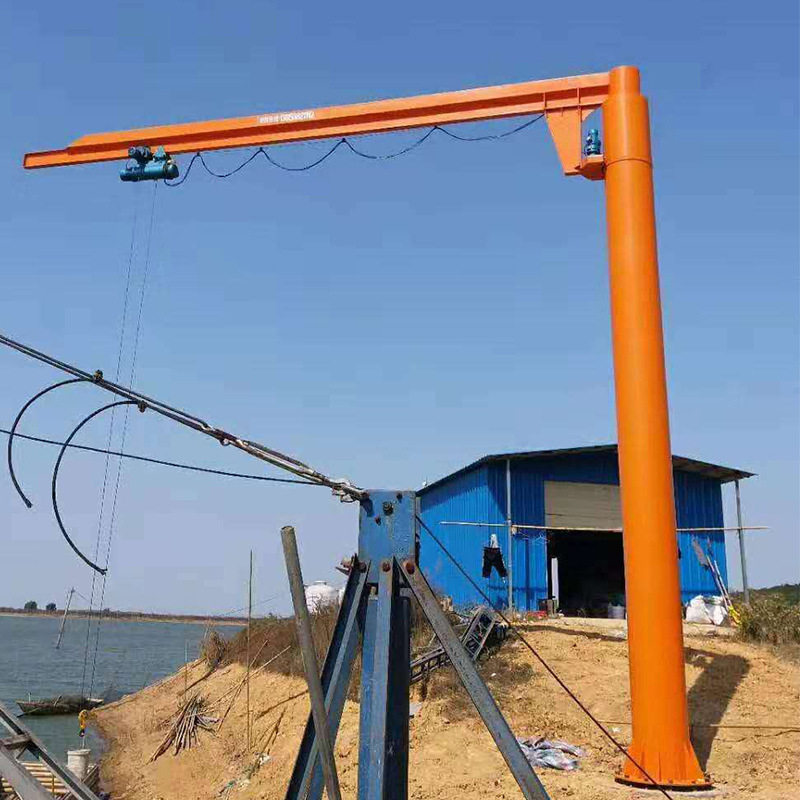 懸臂吊起重機工作強度為輕型,起重機由立柱,回轉臂回轉驅動裝置及電動葫蘆組成,立柱下端通過地腳螺栓固定在混凝土基礎上,由擺線針輪減速裝置來驅動懸臂回轉,電動葫蘆在懸臂工字鋼上作左右直線運行,并起吊重物。起重機旋臂為空心型鋼結構,自重輕,跨度大,起重量大,結實好用。